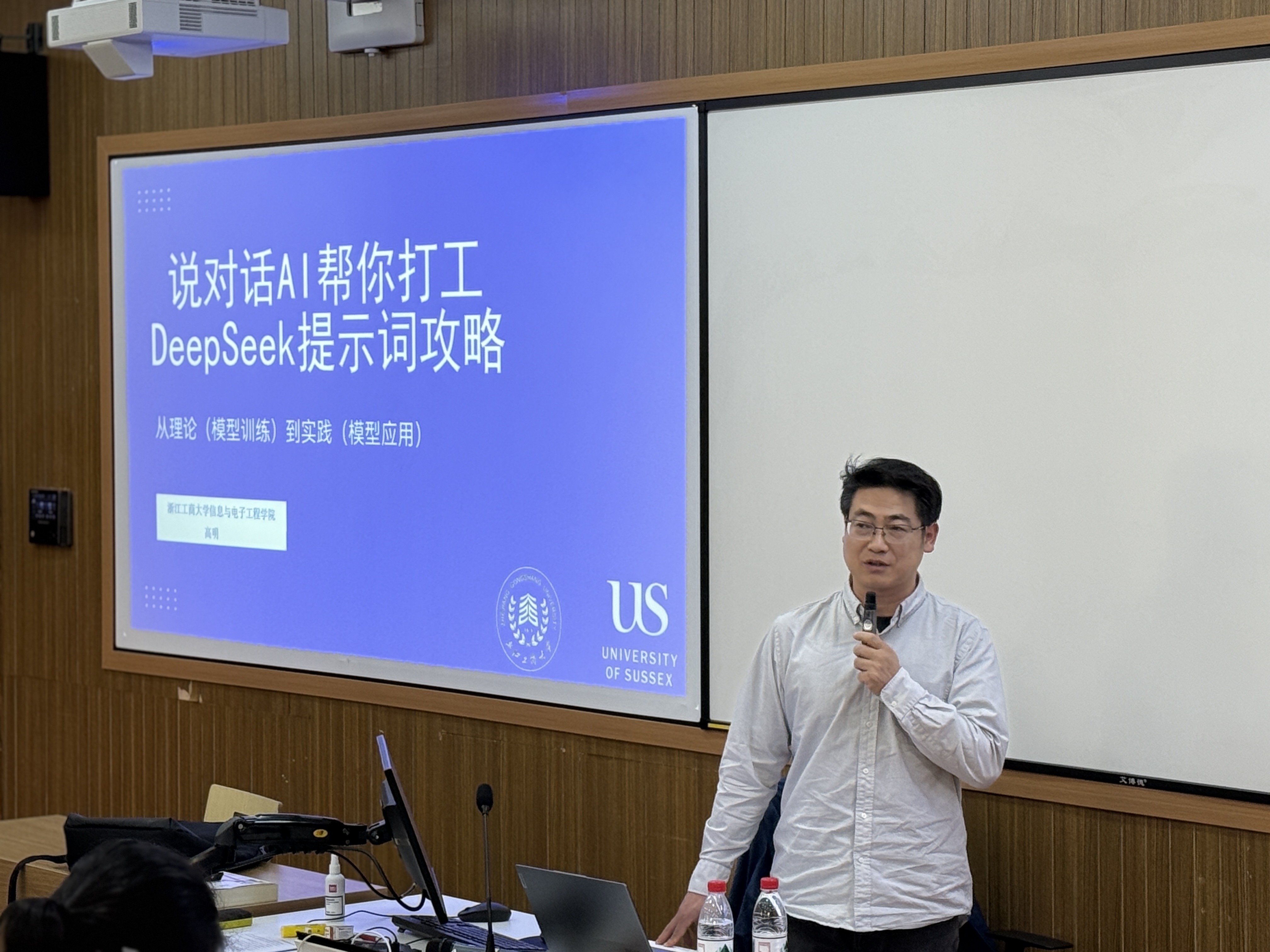 本次培训特邀我校信电学院高明副教授担任主讲。他系统梳理了DeepSeek模型,特别是强大的DeepSeek R1推理模型从基础训练、强化学习优化到最终应用的完整技术路径,揭示了其背后“思维链”的运作机制。重点讲解了针对DeepSeek R1模型的特色提示词(Prompt)技巧。此外,他还介绍了如何通过“反向PUA”“激发深度思考”等进阶技巧,引导模型产出更高质量的答案。这些贴近企业实际需求的场景演示,为各校办企业探索技术应用提供了极具价值的思路。