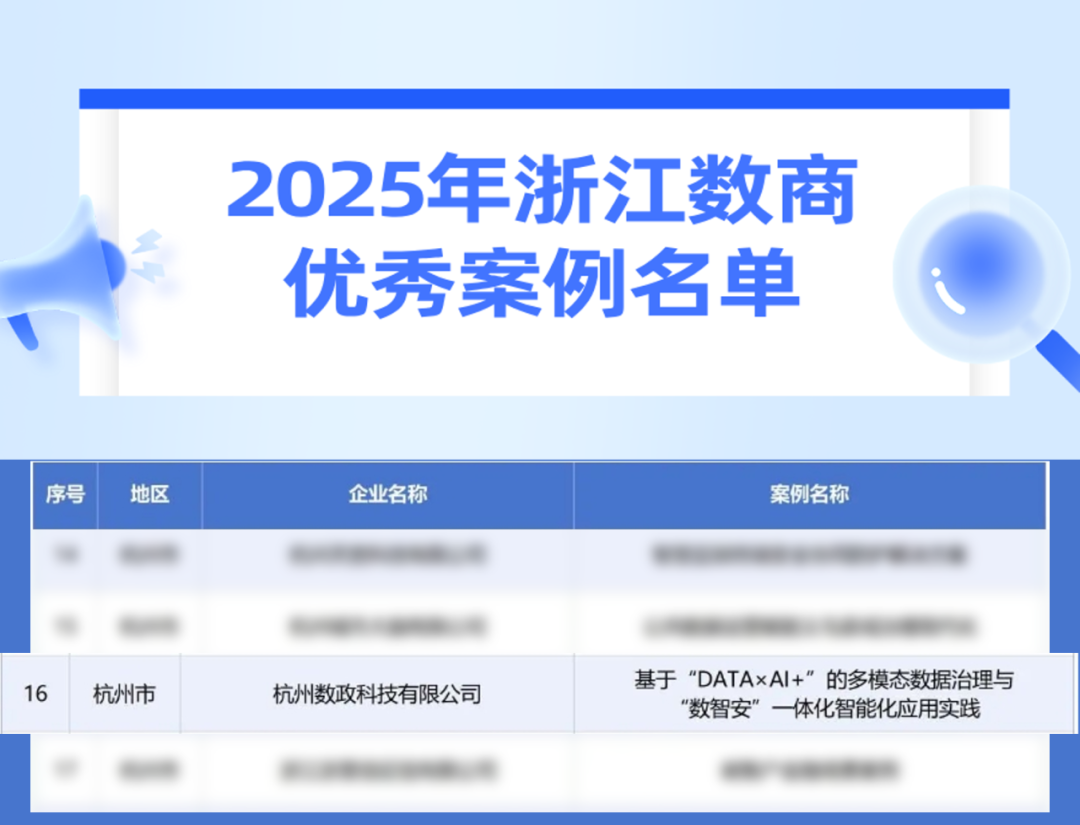 近日,浙江省经济和信息化厅公布了2025年浙江数商优秀案例名单。浙商大创业园入驻企业杭州数政科技有限公司(以下简称“数政科技”)申报的“基于‘DATA×AI+’的多模态数据治理与‘数智安’一体化智能化应用实践”案例,凭借卓越的创新与应用成效,从众多申报案例中脱颖而出、成功入选。标志着数政科技“DATA×AI+”相关产品及应用实践成果获得了官方高度认可 。