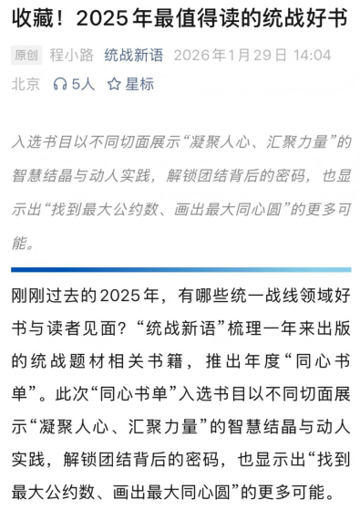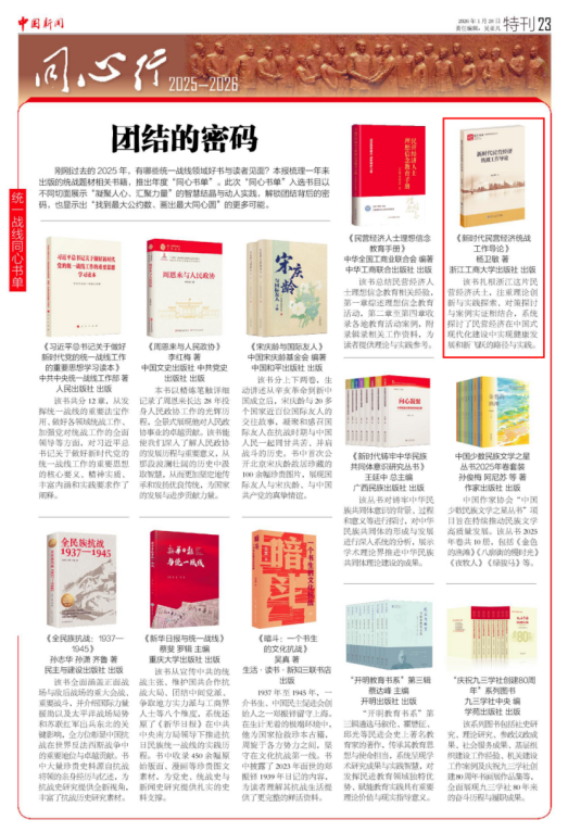 近日,中共中央统一战线工作部官方公众号“统战新语”梳理了2025年统战领域优质出版物,重磅推出年度“同心书单”。入选书目以不同切面展示“凝聚人心、汇聚力量”的智慧结晶与动人实践,解锁团结背后的密码,也显示出“找到最大公约数、画出最大同心圆”的更多可能。